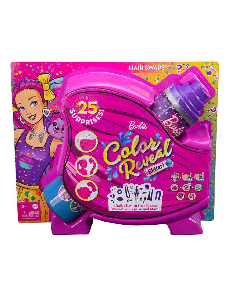 مع 25 مفاجأة في عبوة واحدة، تقدم دمى Barbie Color Reveal Glitter! Hair Swaps تجربة فك العبوة المثالية مع ابتكار Original Color Reveal اللامع و10 قطع شعر مختلفة قابلة للتوصيل